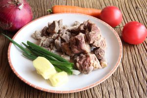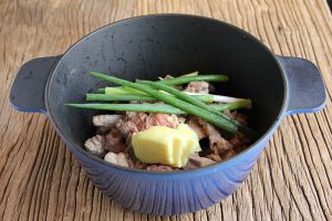 过了水的牛肉和牛尾,放入生姜、葱和料酒,