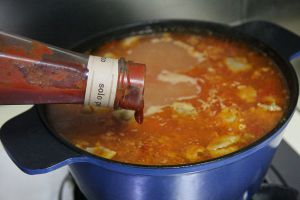 10、倒入适量番茄酱,继续小火慢炖,炖到牛肉和牛尾彻底酥烂,最后放入适量精盐,调味