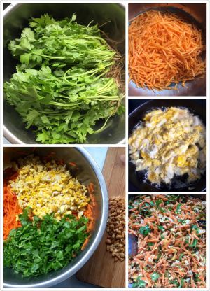 剁馅,鸡蛋煎好剁碎,花生米炒熟拍碎,芹菜苗切好,胡萝卜擦丝放盐腌十年分钟,放鸡蛋和芹菜苗,放盐鸡精香油拌好,包的时候放花生碎!