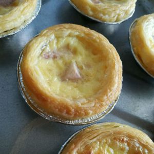 桃子切小丁,放入蛋挞皮,每个两小块就可以,然后把调好的蛋挞液用勺子盛进去,别太满