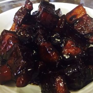 热锅凉油(油量少一些因为五花肉也会出油)加入二分之一白糖,小火(很重要!不然容易糖炒糊)翻炒至白糖融化起色