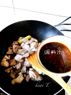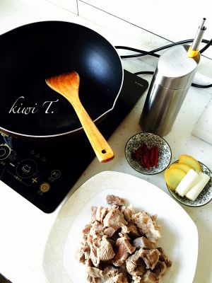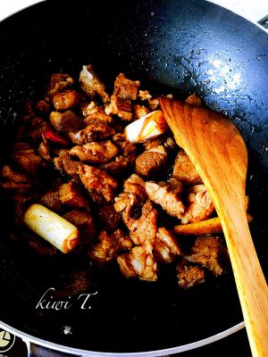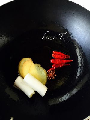 葱、姜、干辣椒和大料(八角)爆锅,炒香。