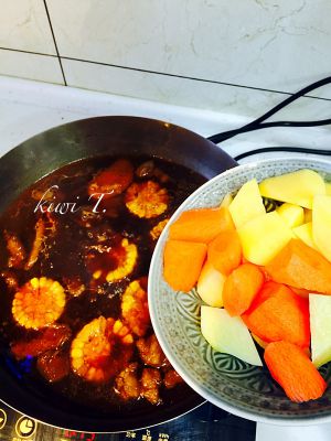 加土豆和胡萝卜,再炖15分钟。(高压锅5分钟)