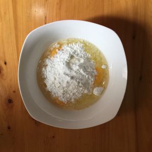 开始腌肉时加入一个蛋清,碗中剩下了蛋黄一个,另向碗中打入2个鸡蛋,加入淀粉和匀(淀粉要慢慢加入手工搅拌至粘稠)。