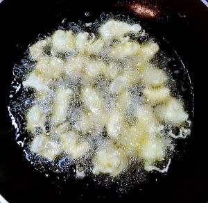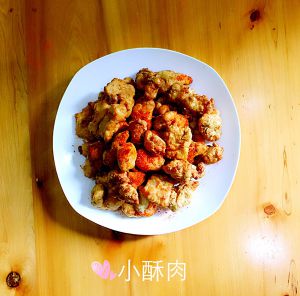 锅里下油,油可以尽量多些,将裏匀淀粉蛋液的五花肉放入热油中炸制,炸至微黄时先捞出沥干油,之后再放入油锅中复炸至金黄捞出装盘即食。