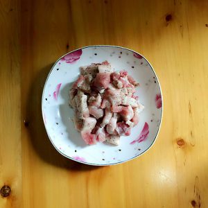 将五花肉去皮洗净切块,加入一个蛋清、适量花椒粉、适量盐抓匀,腌制10一15分钟。(不喜欢花椒者也可以不放,不喜欢五花肉的可以用里脊肉哦。)