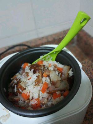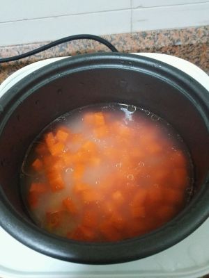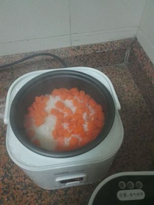 正常做饭程序,把红萝卜丁放进去,滴点油,放小半勺盐,搅匀。然后盖上电饭煲!