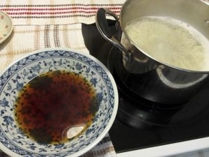 烧一大锅水,煮开放盐,然后把面条煮好,花花做盖浇面会选择比较细,劲道的面条,汤碗中放一点点生抽,浇上煮面水。