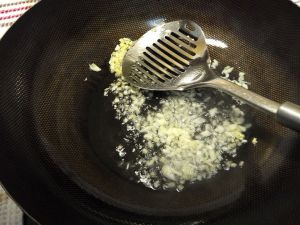炒到羊肉表面断生,放一汤匙的生抽,和一点点孜然粉,要吃辣的这个时候杨一点点辣椒油。炒均匀