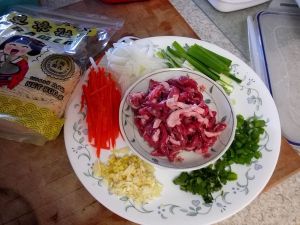 羊腿肉切比筷子略细的丝,放点油,拌均匀,这样比较容易在锅中马上炒开。花花炒羊肉,是不放淀粉腌制的,要多就是羊肉肥肉部分表面略焦的味道。洋葱,胡萝卜切丝,葱切段,留一点葱花和香菜末。