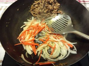将羊肉拨到一边,用炒过羊肉的油,炒洋葱和胡萝卜,它们都是吸收了动物油脂会特别香的素菜,炒软熟。