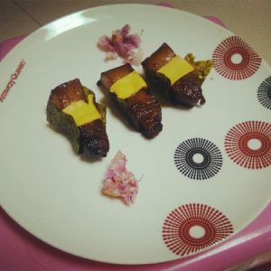红烧肉(熟的)一块,芝士一片,海苔一片