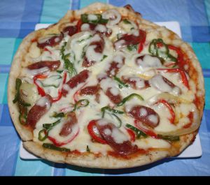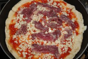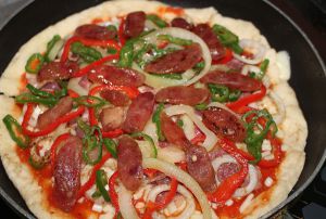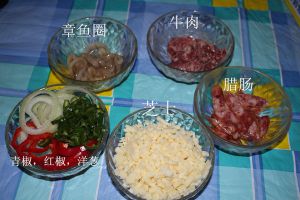 把章鱼圈,青椒,红椒,洋葱,腊肠全部铺上去。怎么好看怎么弄,因为这些都基本熟了