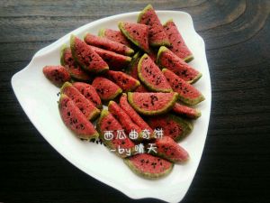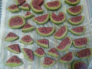 把面团分成两份一大一小面团,小的和抹茶糊混合揉成绿面团(代表西瓜皮),