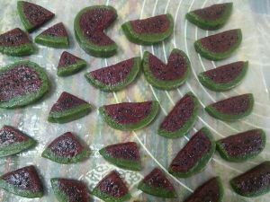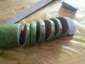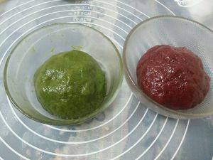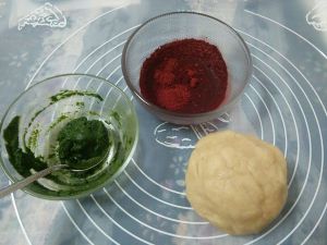 上述图我是做好一个白面团,再分成大小两份之后分别分开开加入绿色粉和红色粉,
