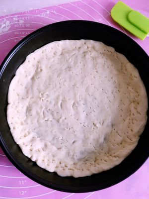 取出一半,盘子里抹点黄油防粘,擀面杖擀圆铺在盘子里,用牙签戳了小孔防止烘烤鼓起来!