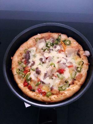 刷了自制披萨酱,铺上马苏里拉芝士,和淡炒过的材料,烤箱预热240度,披萨220度烤15分钟,最后再撒上点芝士烤,烤2分钟!就OK了!