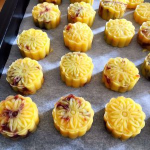 待稍凉后,将绿豆分开30g左右绿豆团,搓圆按扁加入15g左右红豆沙再搓圆,放入月饼模具按压成型。成品,放入冰箱冷藏效果更加。