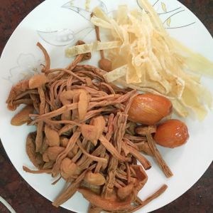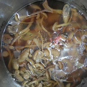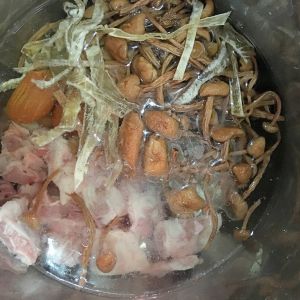 把茶树菇,花胶,蜜枣一起放入高压锅里