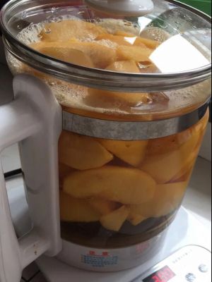 将四分之一的桃肉放入养生壶,添加250g糖,我的养生壶是2L的,而且想多喝桃汁,就放了四分之一桃肉进去,煮30分钟