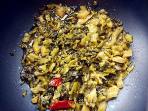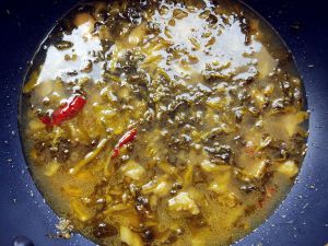 热锅热油,爆香姜片和蒜泥后,下野山椒和四川泡菜炒出香味。因为孩子吃不了太辣的,所以野山椒只放了一个