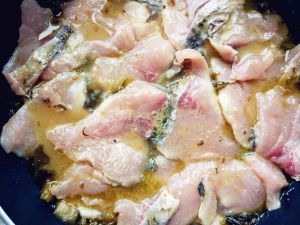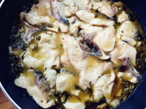 加入剁碎的腌萝卜(酱腌菜,没有可不加),鸡精,糖,白胡椒粉,盐和水(水量以与鱼片齐平为准),煮沸