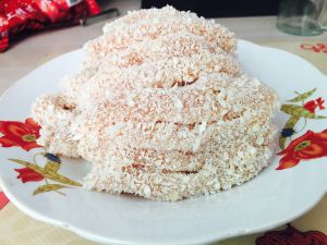 拿出腌制好的鸡柳,裹上面包糠;