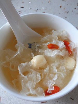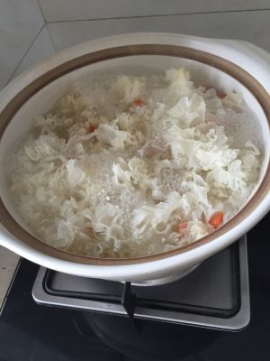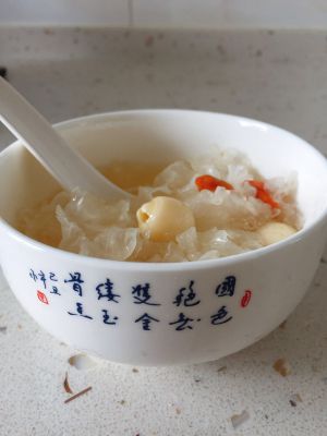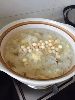 水开转小火以后大概炖15分钟左右,捞出一颗莲子尝尝,如果莲子熟了就可以关火了。 ⚠️注意:炖汤的时候最好用砂锅,因为砂锅保温性好,如果用普通的锅火候要大一点,时间可能也要长一点。