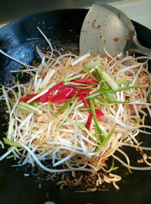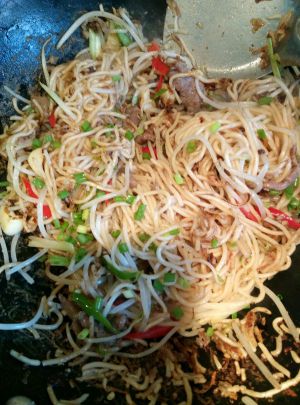 然后放入滤好水的面条,放生抽翻炒至八成熟加入青红椒