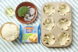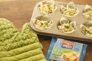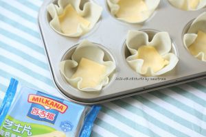 把馄饨皮分次少量刷上油后放入模具内,再放上一块芝士;