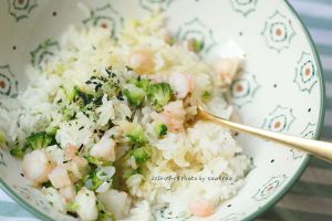 煮到变色后捞出,西兰花切上面的绿色部分,虾仁切碎放入米饭里,加一点饭团调味,鸡蛋液,少许盐,搅拌均匀;