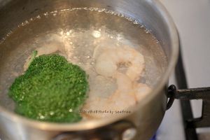 先把西兰花和虾仁放入水中煮下,加少许油和盐;