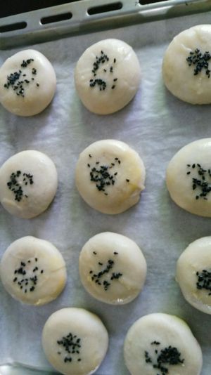 全部包好豆沙馅。烤箱200度预热,压扁,刷全蛋液,沾上芝麻, 200度中层25分钟