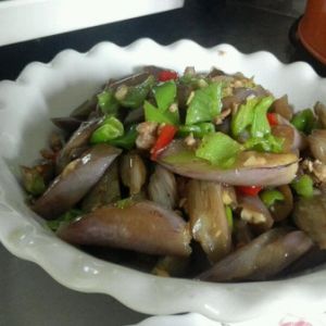 热锅热油放入蒜爆香,倒入肉末,加黄酒酱油滴醋炒散,倒入炸好的茄子翻炒片刻,放入盐、白糖,炒匀后倒入青红椒丁,再翻炒片刻出锅即可~