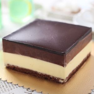 接着以同样的方法制作黑巧克力慕斯糊,然后倒入白巧克力慕斯上面,继续放入冰箱冷冻10分钟左右