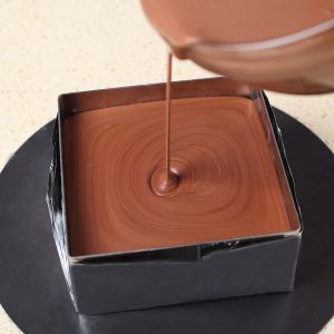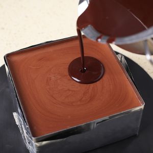 黑巧克力慕斯表面凝固,巧克力淋面的温度大约20度左右就可以淋至黑巧克力慕斯上面,放入冰箱冷藏2小时即可。