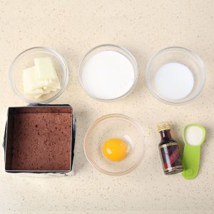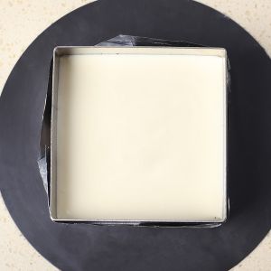 淡奶油与巧克力液混合均匀后,将白巧克力慕斯糊倒入慕斯圈中,放入冰箱冷冻10