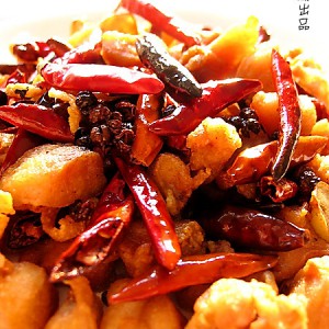 锅中留适量底油,放入蒜片爆香,下干辣椒段和花椒、麻椒,炒出麻辣香味。