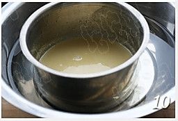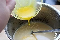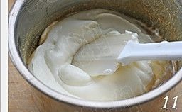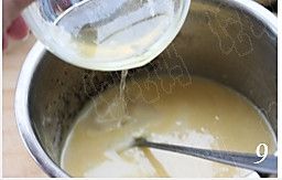 冷却至不烫手时约40-45度,加入打散的蛋黄,搅拌均匀;