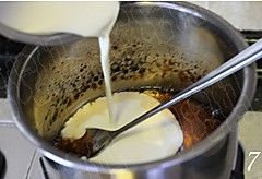 迅速将牛奶溶液倒入焦糖中,关火,搅拌均匀;