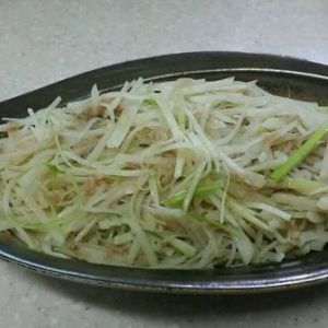 土豆切丝水洗控水,锅里放色拉油+金枪鱼罐头翻炒+土豆丝+盐,炒到土豆熟放葱丝就可以了