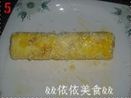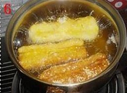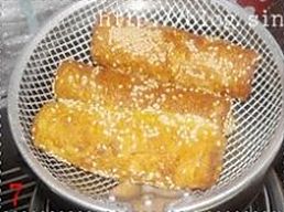 油烧至5成热,放进面包卷,中火炸至金黄(大约3分钟);