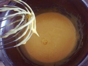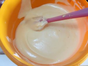 用手动打蛋器,把所有材料搅拌均匀,做好乳化作业,让它们充分的融合在一起,这时蛋黄糊变得细腻无颗粒。(时间约为3分钟)