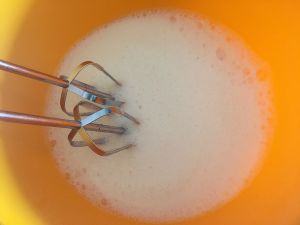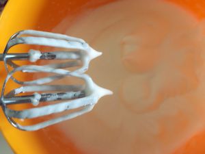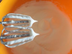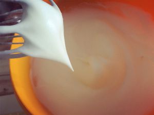 蛋白开始发泡,继续高速打发,一直打发到提起形成小小尖勾,然后加第二次糖。