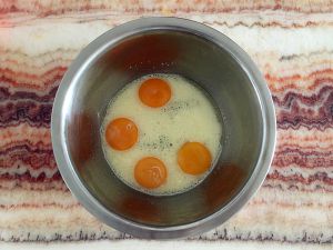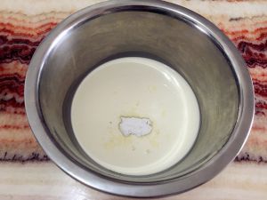 蛋清和蛋黄分离后,蛋清送入冰箱冷藏,蛋黄盆里倒入牛奶和油,让牛奶和油充分包裹蛋黄,放一边备用。