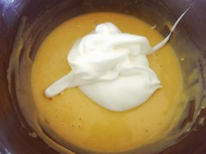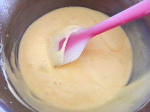 用翻拌的手法,混合蛋白霜和蛋黄糊,均匀无杂质。
