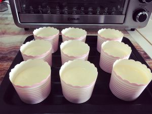 用勺子,把面糊舀入杯中,并轻轻震出气泡,杯子中的面糊6-7分满。(如果不加奶油,可以放8分满)。