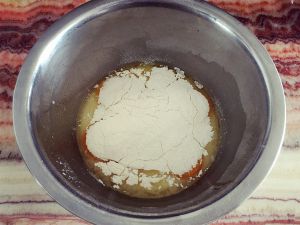 把低筋面粉过筛,倒入之前的混合的蛋黄盆里。