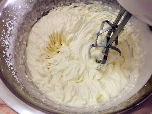 打发好的奶油,有清晰的纹路。(夏天为了避免化得较快,可打发好的奶油霜放入冰箱冷冻10分钟)