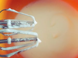 从冰箱取出淡奶油加糖进行打发。(夏天可坐一盆冰水打发)